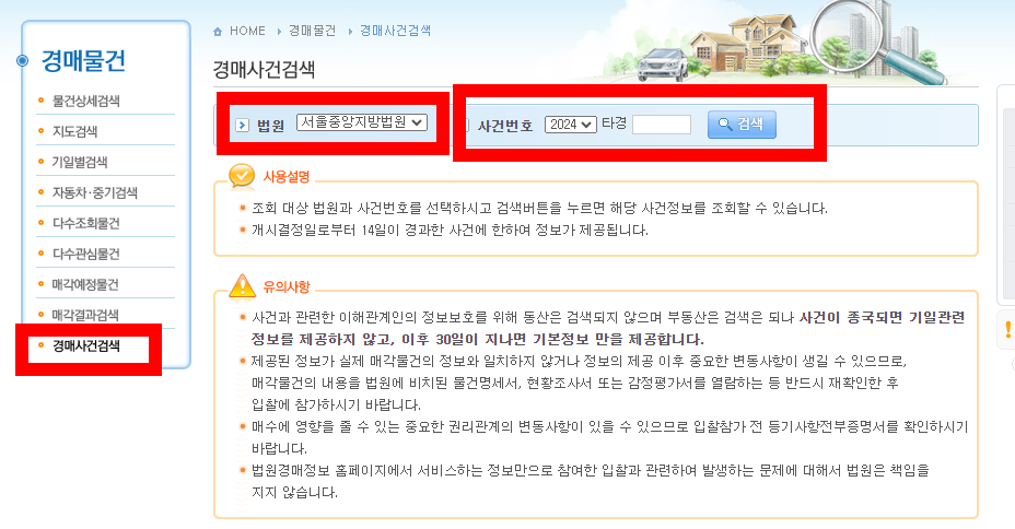 이 메뉴를 통해 특정 사건번호를 입력하거나, 위치 및 물건 종류에 따른 검색이 가능해요.