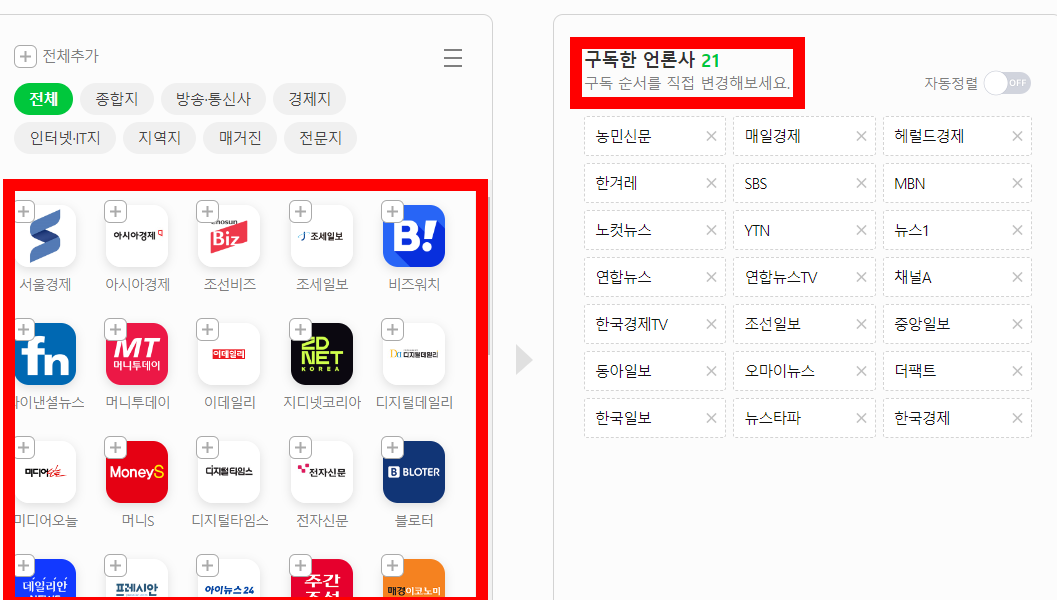 구독을 원하지 않는 언론사가 있으면 구독중버튼을 눌러주세요. 구독한 언론사를 자유자재로 삭제 하거나 왼쪽에서 새로운것을 추가할 수 있습니다.