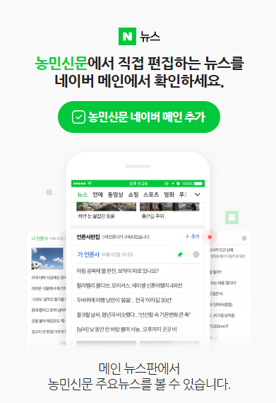 만약 농민신문 네이버 메인 추가를 원하신다면 아래와 같은 메인화면을 만나볼 수 있는데요.