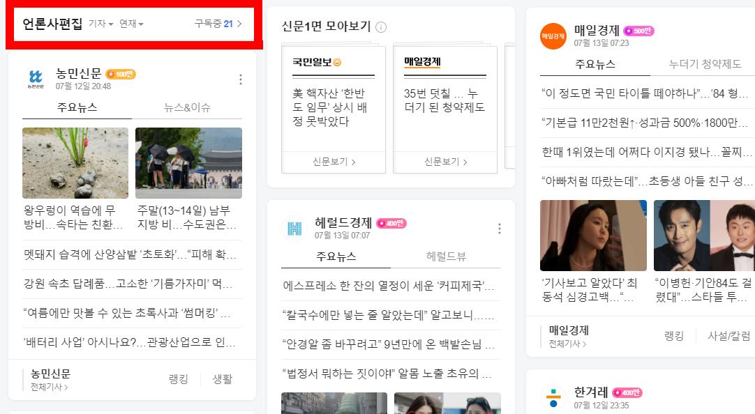 네이버메인에 농민신문을 편집하여 넣는 방식입니다. 네이버 메인에 추가하시면 원하는 언론만 볼 수 있습니다.