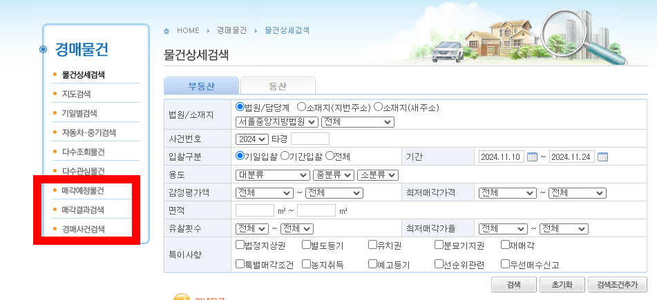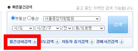 이 메뉴를 통해 특정 사건번호를 입력하거나, 위치 및 물건 종류에 따른 검색이 가능해요.