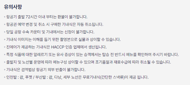 - 기내식은 HACCP 인증 업체에서 생산되며, 특정 식품에 대한 알레르기가 있으신 승객께서는 메뉴를 사전에 확인하시기 바랍니다.