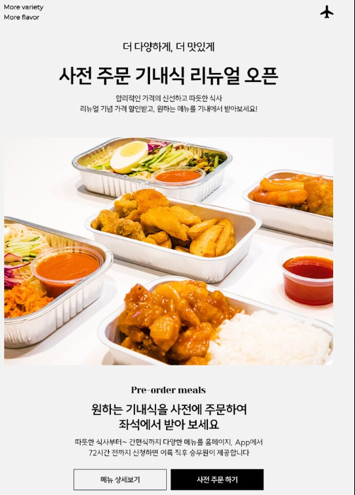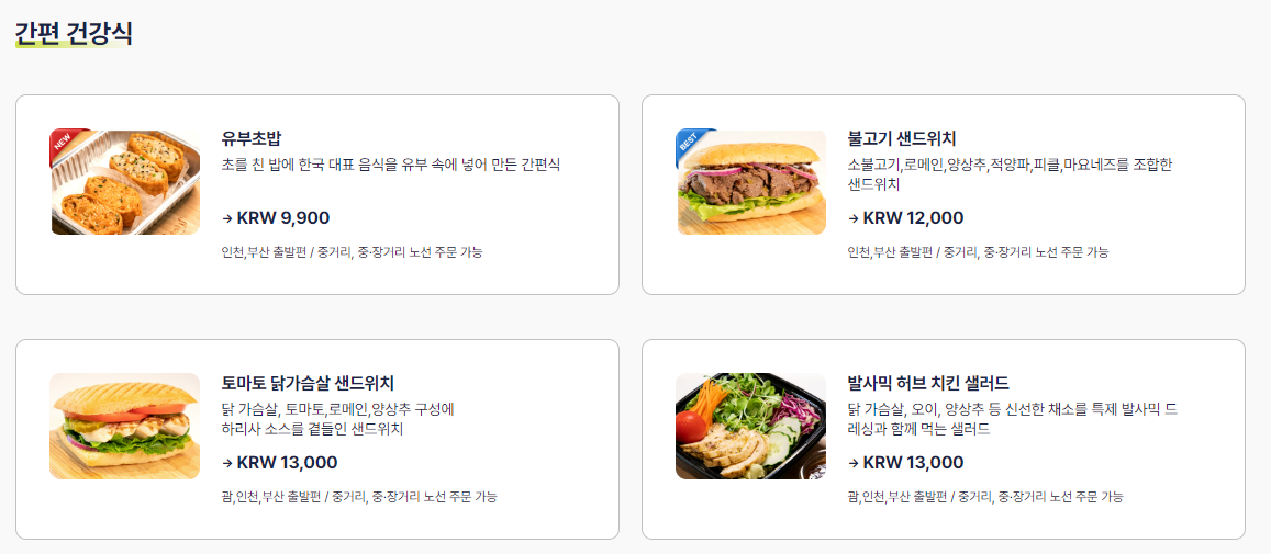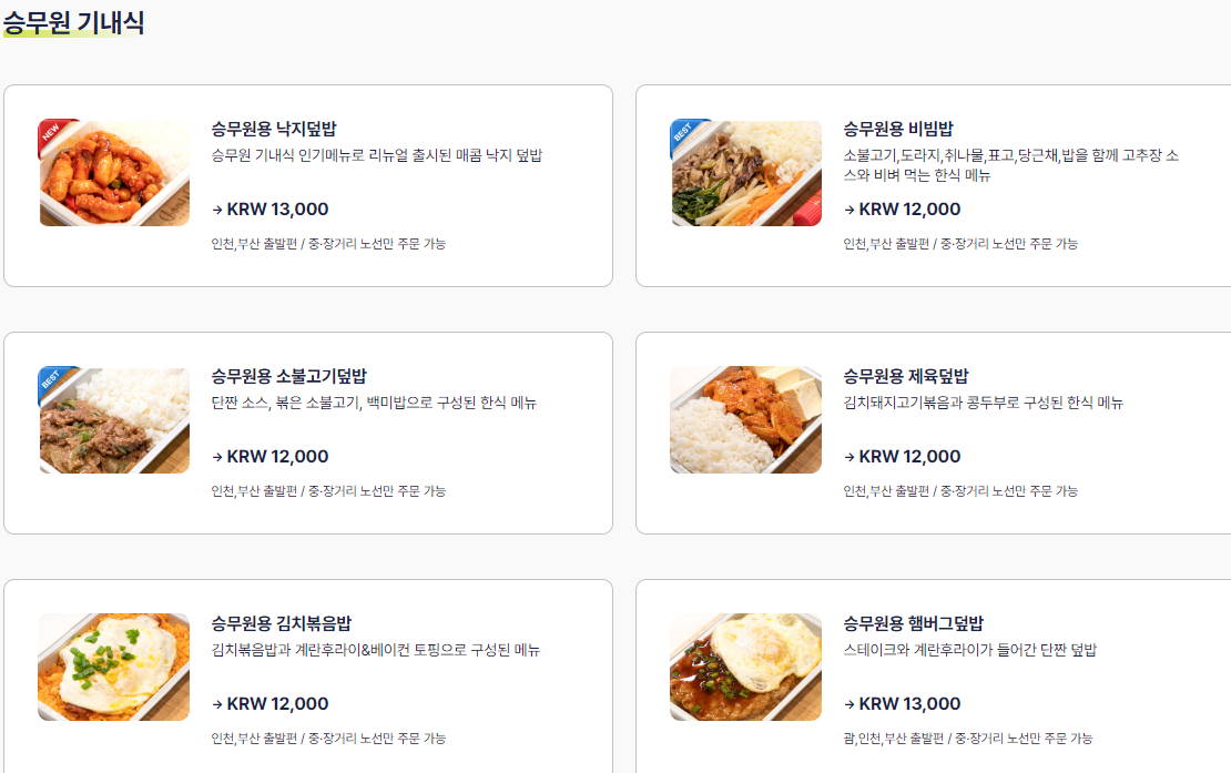 - 출발지 및 노선별로 메뉴 구성이 다를 수 있으며, 조기 품절이나 재료 수급에 따라 취소될 수 있습니다.