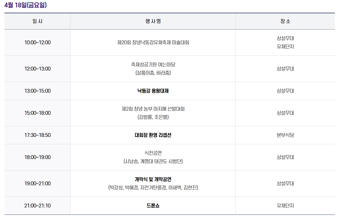 - 장소: 경남 창녕군 남지읍 남지리 835-25, 남지체육공원 일원
