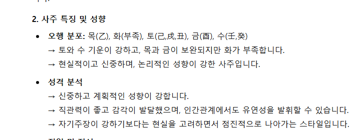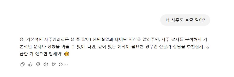 - 미신적인 요소 주의: 챗GPT 사주 해석에 가끔 포함될 수 있는 미신적인 요소들은 가볍게 넘기는 게 좋아요.