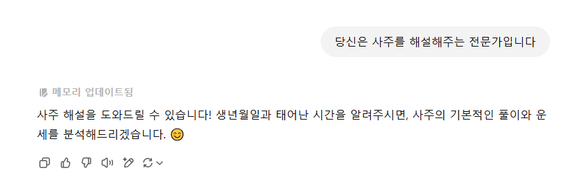 > 역할 부여: 가장 먼저, 챗GPT에게 "당신은 사주를 해설해주는 전문가입니다"라고 역할을 명확히 지정해 주세요. 이렇게 하면 챗GPT가 더욱 전문적인 관점에서 답변을 제공해 줄 거예요.