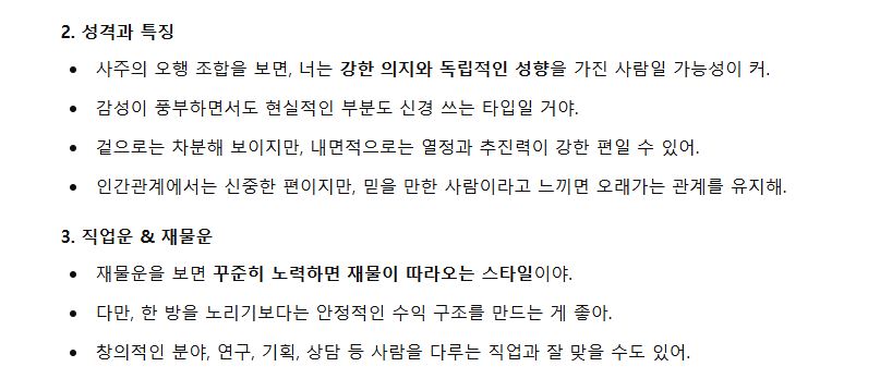 - 전문가 도움: 더 정확한 사주 해석을 원한다면, 전문가의 도움을 받는 걸 추천해요. 오랜 경험과 지식을 가진 전문가들은 챗GPT보다 훨씬 깊이 있고 정확한 분석을 해줄 수 있을 거예요.