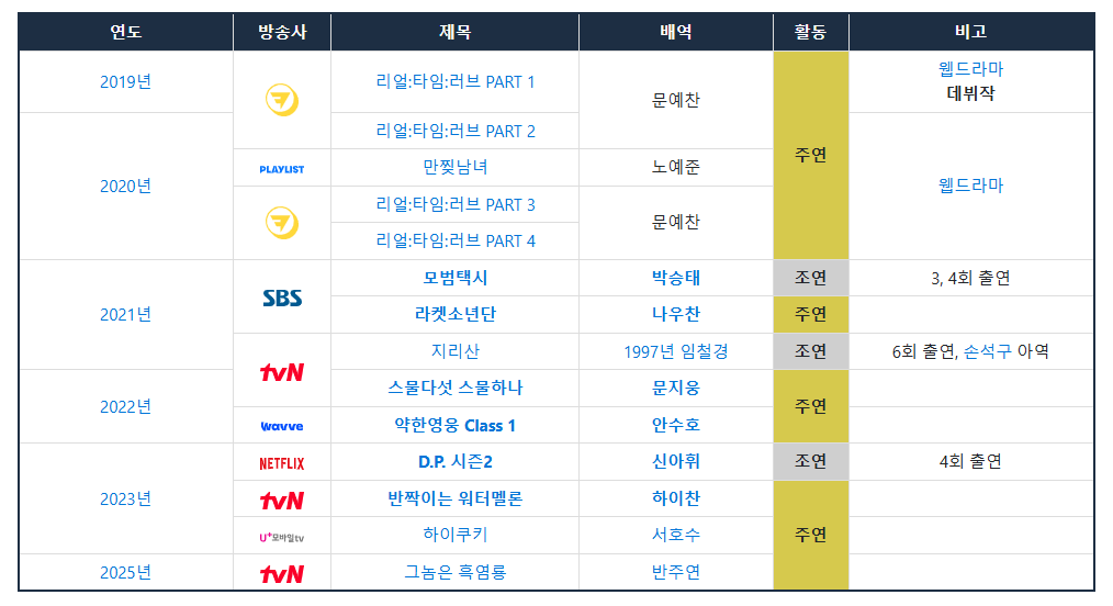 2022년 tvN 드라마《스물다섯 스물하나》에서 문지웅 역을 맡아 감각적인 연기를 선보이며 주목받았습니다. 이후 《반짝이는 워터멜론》**에서 유쾌한 밴드 보이 캐릭터를 맡아 매력을 발산했고,